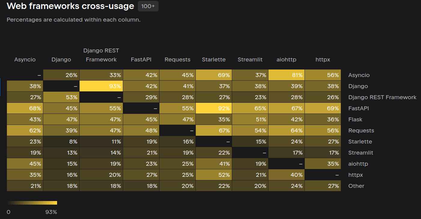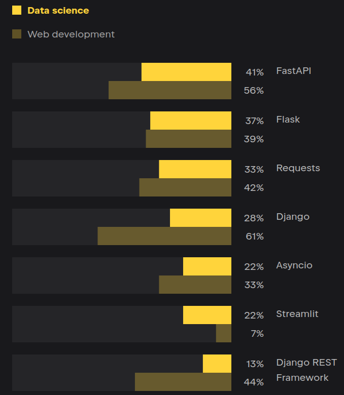 The following table from the same JetBrains Python survey illustrates the rise of async apps with FastAPI.